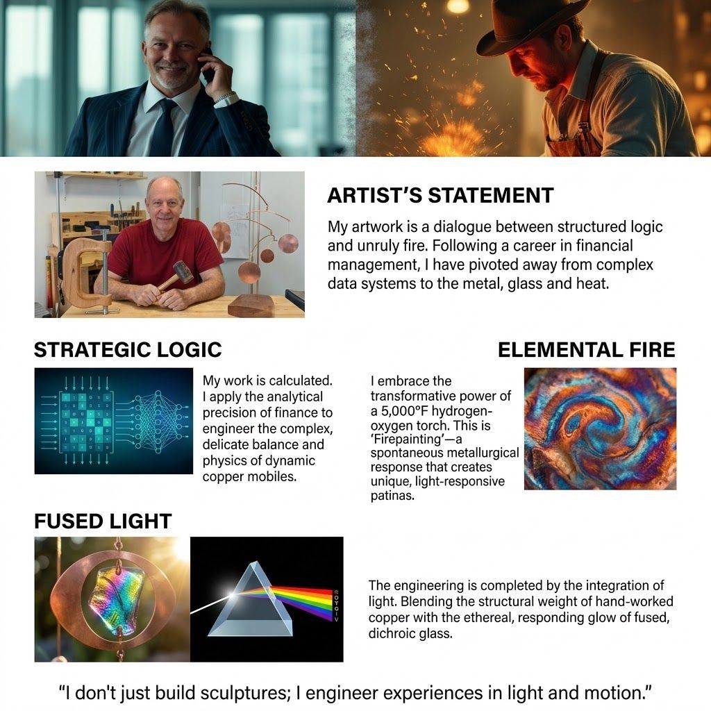 My goal is to evoke elemental wonder. Whether through the quiet rotation of a kinetic mobile or the dimensional relief of a wall sculpture, I capture the tension between the calculated and the spontaneous. By integrating natural crystals and dichroic glass with "fire-painted" surfaces, I create objects grounded in physics yet elevated by the supernatural. My work asserts that in a digital age, the most profound beauty is still unearthed through the ancient, haptic struggle of hand, heat, and metal.